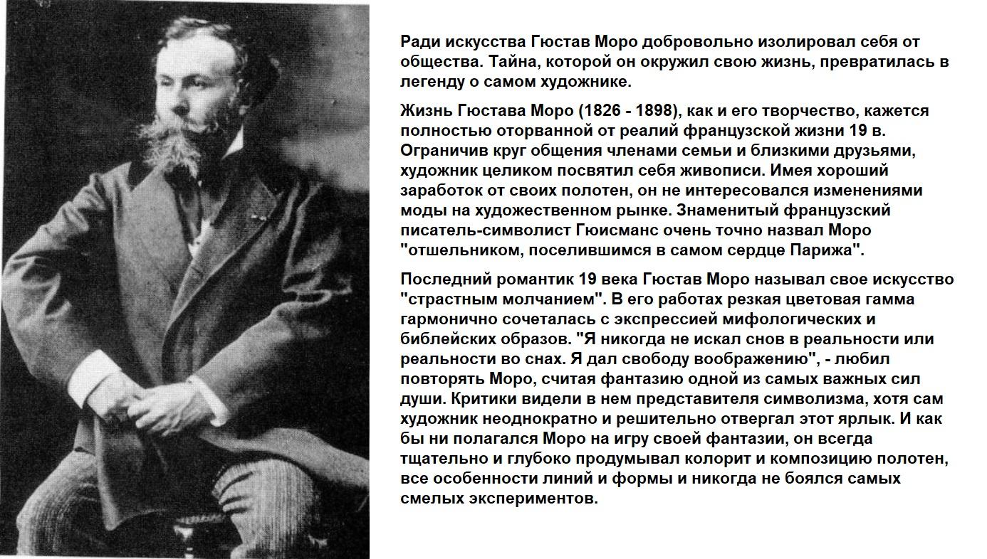 С годами Моро все больше верил в то, что он остается последним хранителем традиций и считал, что живопись импрессионистов поверхностна, лишена морали и не может не привести к духовной гибели.