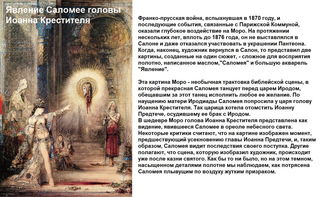 На протяжении 1860-х годов он написал серию картин, которые были очень хорошо встречены в Салоне. То было время триумфа реалистической школы, и критики объявили Моро спасителем жанра исторической живописи.