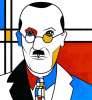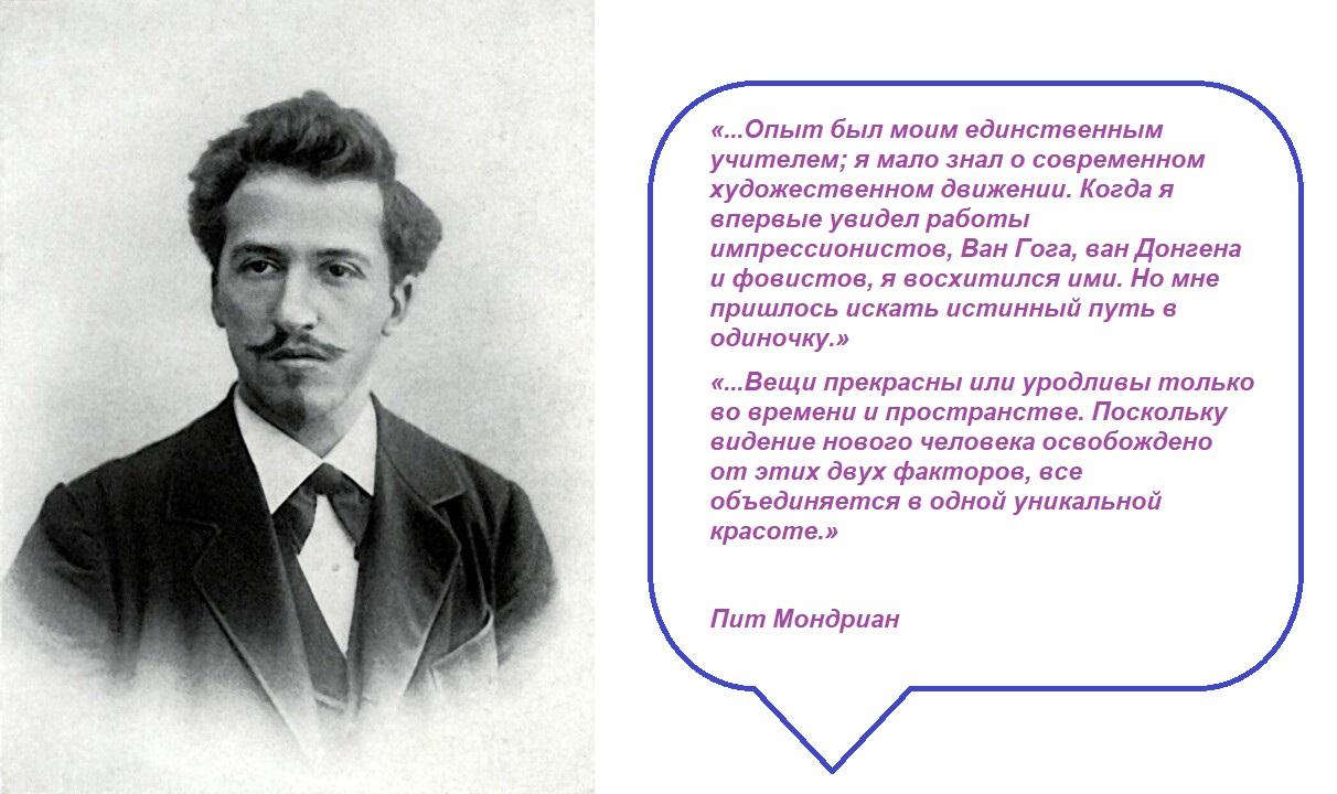 «Палка, палка, огуречик, получился»... самобытный и до абсурда упрощённый стиль Пита Мондриана Он создавал свои шедевры из элементарных линий и форм. Больше всего Мондриан известен своими работами начала 20-х годов прошлого века, где он упростил все формы до горизонтальных и вертикальных линий. Получившиеся прямоугольники художник заполнил основными цветами палитры. Пит представил своё ощущение мира в виде противоположностей: вертикали и горизонтали, плюса и минуса, динамики и статики, мужского и женского начала.Прекрасная работа, очень похожая. Я для сравнения разместила рядом три автопортрета художника - 1900, 1918 и 1930 гг.