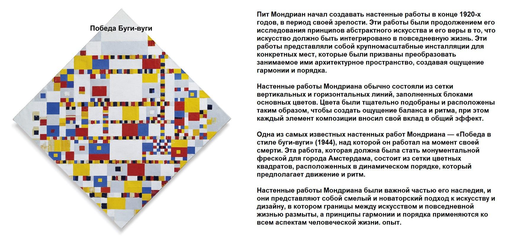 Переломным моментом в творчестве Мондриана стало посещение выставки современного искусства в Амстердаме в 1911 году, где на него произвели глубочайшее впечатление работы кубистов Пикассо и Жоржа Брака. Мондриан переехал во Францию иначал работать в жанре высокого кубизма и превзошёл своих предшественников. Пит отказался от изображения предметов и природных элементов. С помощью геометрии Мондриан пытался исследовать законы мироздания и передавать их через живопись.