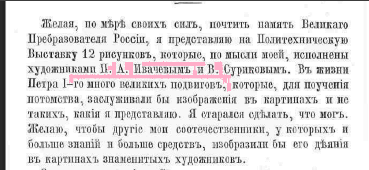 А пока он получает престижное предложение. В 1872 году к Московской промышленной выставке российский меценат Михаил Сидоров сделал учащимся академии Ивачеву и Сурикову заказ на серию живописных полотен из жизни Петра I к 200-летию со дня его рождения. За четыре месяца молодые художники создали 12 живописных полотен. По результатам работы была издана книга литографий. Авторство на каждой литографиях и полотнах указано не было, и в настоящее время сложно установить, какую картину писал Суриков, а какую – Ивачев. Тем более, что все картины, кроме двух, утеряны.
