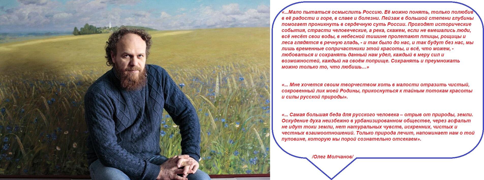 «…В картинах Молчанова столько души, столько сердца, столько проникновения! Так чувствовать может только человек, глубоко любящий свою Родину. Он ведь не только живописец, но и поэт. Как и знаменитые предшественники, он тонко чувствует и передаёт поэзию родного края, воплощает в своих работах лирический образ России. Вместе с тем в картинах Олега Молчанова звучит нота грусти, ибо пишет он Россию уходящую… »