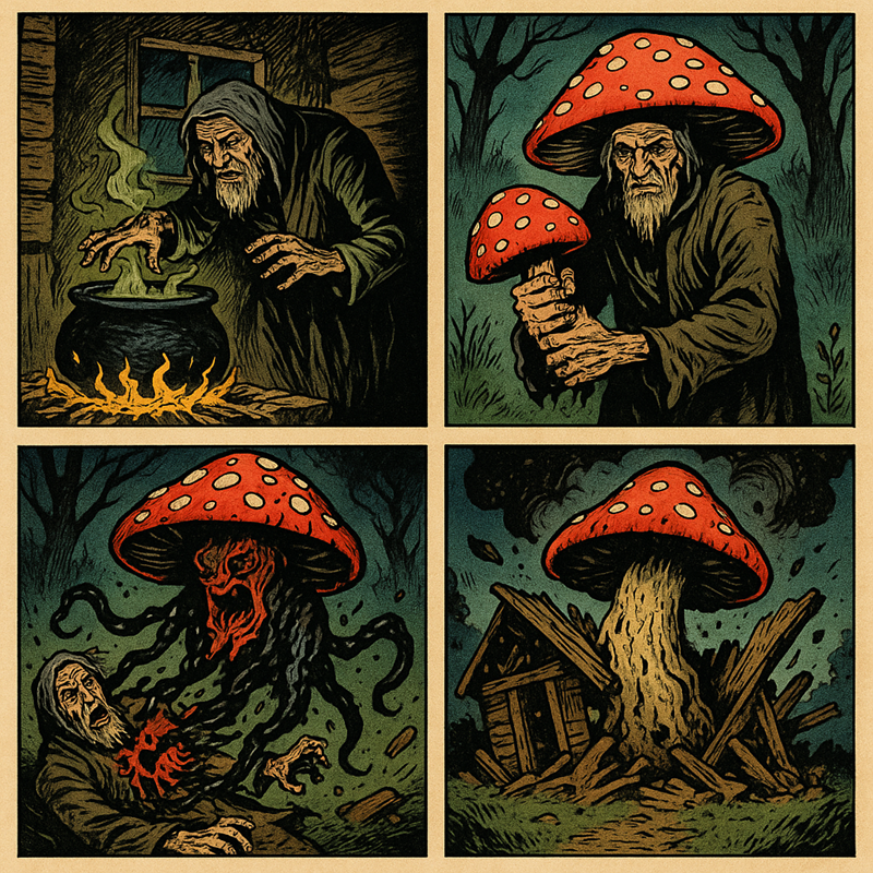 Однажды он нашёл ярко-красный мухомор. Шляпка блестела, словно глаз. Он кинул гриб в кипящий чан, и всё вокруг стихло. Лес будто втянул воздух. Вода в чане вспухла, разорвала стенки. На полу разлилось жёлто-кровавое месиво. Из него поднялся гриб, вырос, как человек, но кривой, с трещинами. Шляпка дергалась, капая чернотой