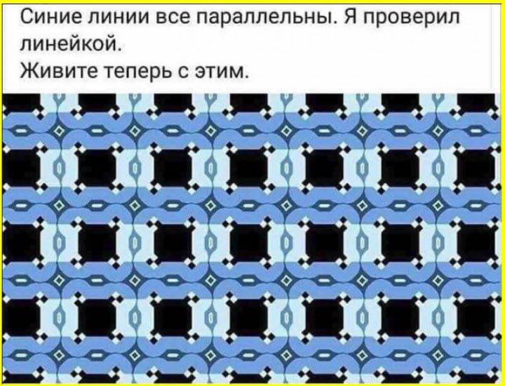 Самая поразительная оптическая иллюзия из всех, что я видел! Глядишь: ну так явно наискосок друг другу идут, ну сейчас пересекутся! Проверил линейкой - что за черт - параллельные! Невозможно поверить, чертовщиной попахивает!