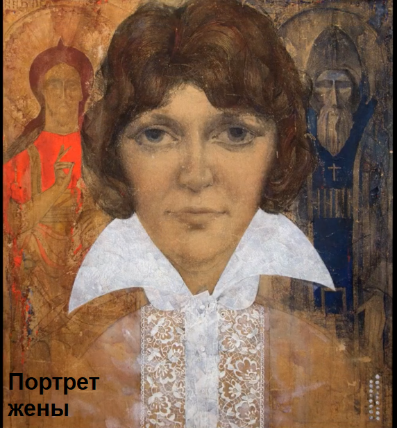 Позже, когда супруги уже вернулись в Иваново, жена Станислава поступила в Ленинградскую Академию художеств, где изучала историю искусства древней Руси. Тогда художник и написал портрет жены с ликами святых - один из многих, любимую супругу он рисовал очень часто - но очень смелый и необычный по тем временам.