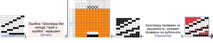 подскажите, пожалуйста, как боретесь с ошибкой Ошибка: Кроссворд без метода "проб и ошибок" нерешаем (Отчет)? никак не дает сайт выставить крос ((( изменяю уже тысячный раз, все равно не дает. Может быть чем то польхуетесь, моя прога говорит, что крос решаем и решение 1. А сайт не дает выставить
