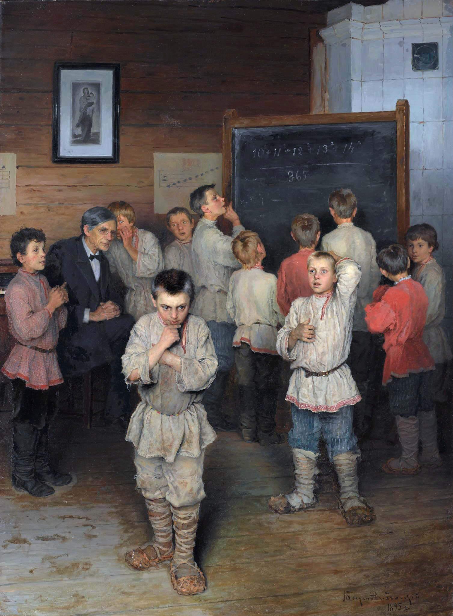Картины на ту же тему. Богданов-Бельский "Устный счёт в народной школе Рачинского" и Решетников "Опять двойка". Государственная Третьяковская галерея. Спасибо