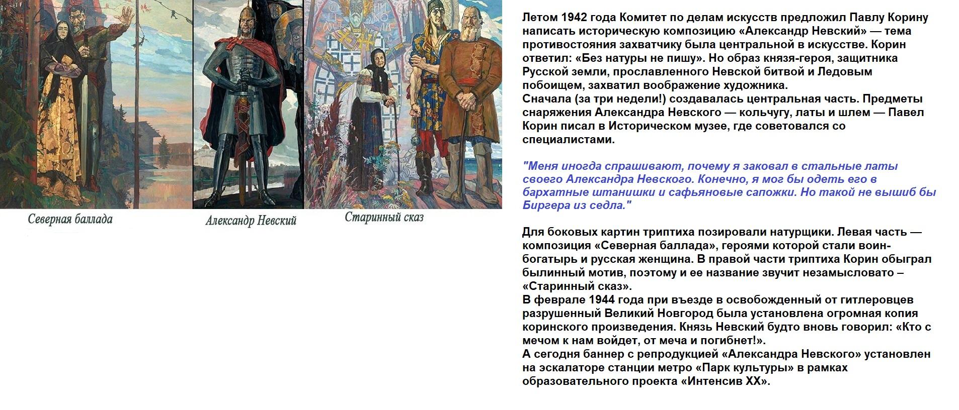 Одна из самых известных работ автора в этом направлении — триптих с Александром Невским. Он был написан во время войны и стал воплощением силы духа и мужества нашего народа.