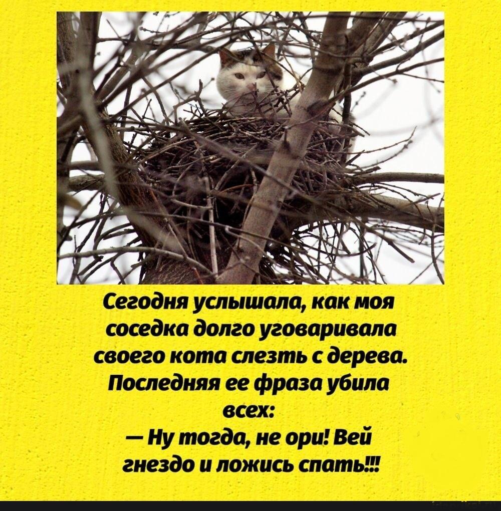ответитьУмные люди утверждают, что в такой ситуации паниковать и суетиться (и уж тем более - вызывать спасателей, у которых уйма гораздо более важных и срочных дел) не стоит! Аргумент прост: вспомните, вы хоть раз видели на дереве скелет кота? :о