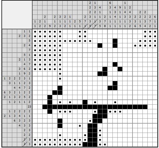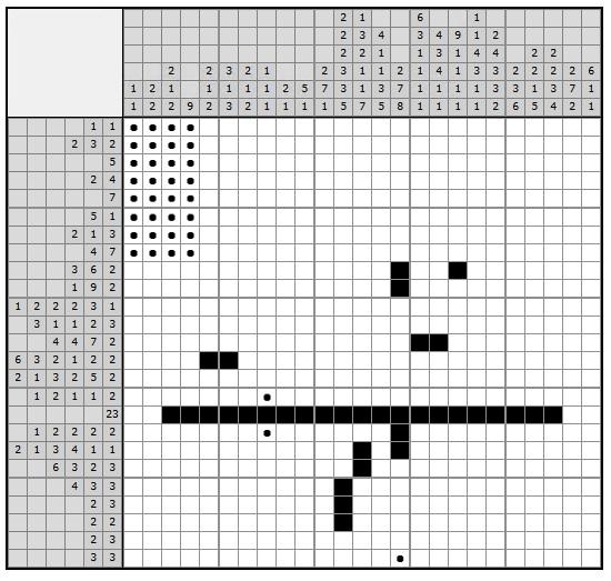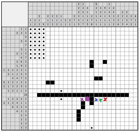 Влан, спасибо за нескучное решение! Как всегда у Вас, трудно было просчитать правильное начало (вертикаль справа), А горизонталь из 23 пикселей продлила все-таки по наибольшей вероятности (угадала). Остальное всё логично))