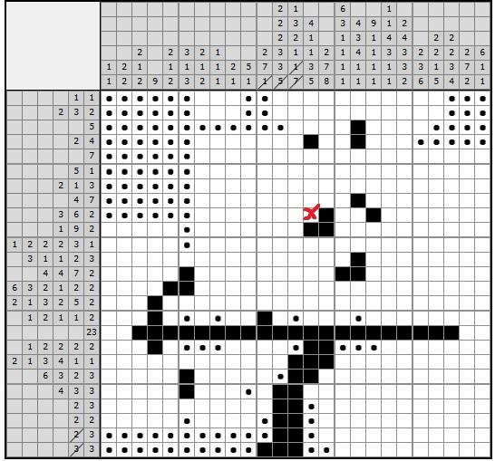 Как Вам не ай-ай-ай! Я уже не восстановлю решения, выцарапывал буквально по одному крестику, клеточке, но все строго логично. Лучше берите подсказку и анализируйте, почему она, компьютера, так решила. Или делайте скриншот и выставляйте для хелпа.