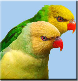 Окрас в основном зелено-оливковый с желтой головой. Вокруг шеи воротник бледно-зеленого цвета. Клюв – оранжево-красный.