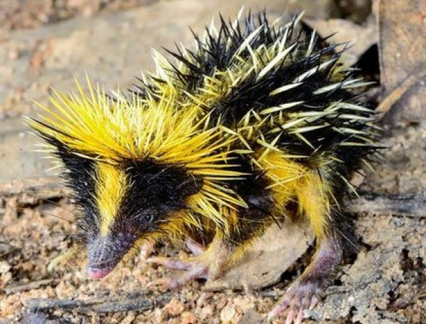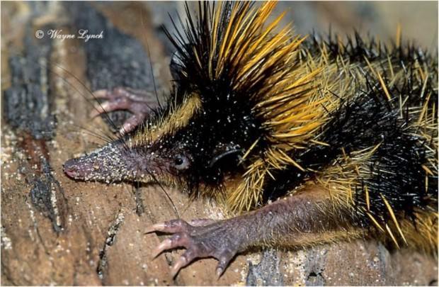 Представьте себе: вытянутая мордочка с желтой полосой вдоль носа, корона из длинных острых иголок и множество колючек, разбросанных по всему туловищу вперемешку с густой черной шерстью, длинные задние и короткие передние лапы с острыми когтями – перед Вами полосатый тенрек, обитающий в тропических лесах Мадагаскара.«Эта зверушка похожа на ежиху, нарядившуюся пчелой на Хеллоуин» - точно! Супер!
