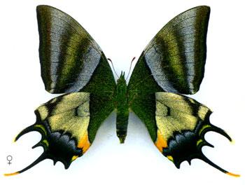 Самки крупнее самцов (размах крыльев ок.12 см) и совсем иначе окрашены. Их задние крылья заканчиваются тремя хвостиками, из которых самый длинный изогнут наподобие самурайского меча и тоже окрашен на конце в ярко-жёлтый цвет. Богатейшие оттенки и тончайшие переходы серых, сиреневых и желтовато-зелёных цветов на её крыльях делают эту бабочку драгоценной для любой коллекции.