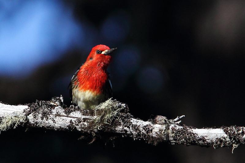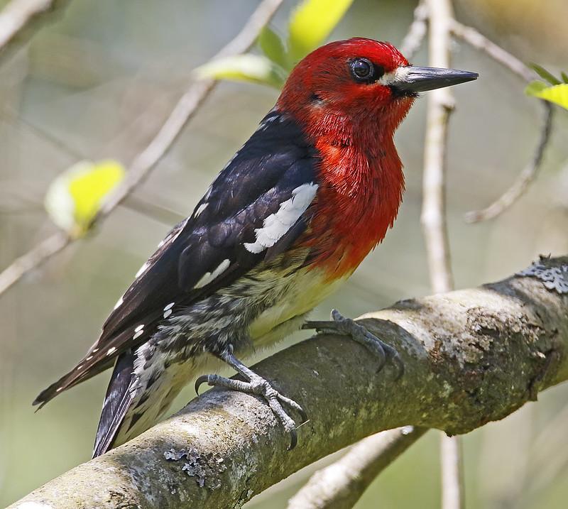 У этих птиц (до 22 см) очень яркая красная голова и такая же грудь с белым пятном на каждом крыле. Спина в основном черная с желтыми и белыми крапинами.