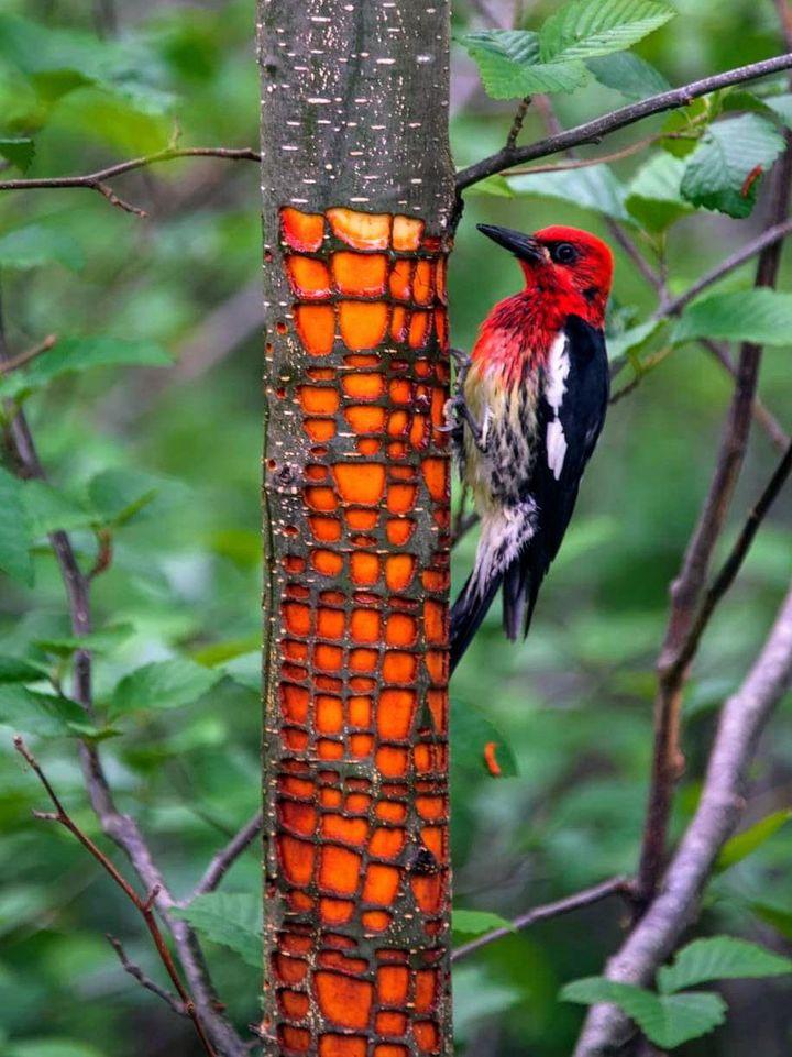 От остальных дятлов его отличает то, что он сверлит сотни крошечных отверстий в дереве-хозяине, наслаждаясь постоянным потоком сока и вылизывая его языками с жесткими волосками. А заодно и насекомых, попадающихся в этом соке. Слюна дятла содержит «антикоагулянт», мешающий соку застывать.