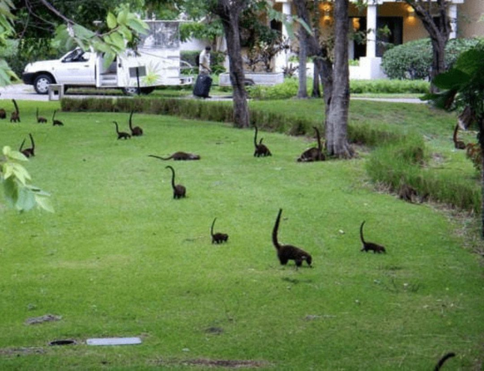 Я очень люблю коати, хотя и знаю, что не все разделяют мое пристрастие к этим очаровательным животным. Я нахожу что-то очень трогательное в их длинных шершавых носах со скошенными кончиками, в их пальцах, торчащих в разные стороны, как у голубей, в их медвежьей походке и манере держать трубой полосатый хвост, похожий на пушистый восклицательный знак. На воле они держатся довольно большими стаями. Бродя по лесу, они переворачивают стволы упавших деревьев и камни, обнюхивая каждый укромный уголок и каждую щель своими носами, похожими на пылесос, потому что пищей им может служить все – от жуков до птиц, от фруктов до грибов. Как и большинство мелких стайных млекопитающих, они общаются друг с другом с помощью богатого набора всяких условных звуков, и я уверен, что "беседы" стаи коати заслуживают специального изучения.