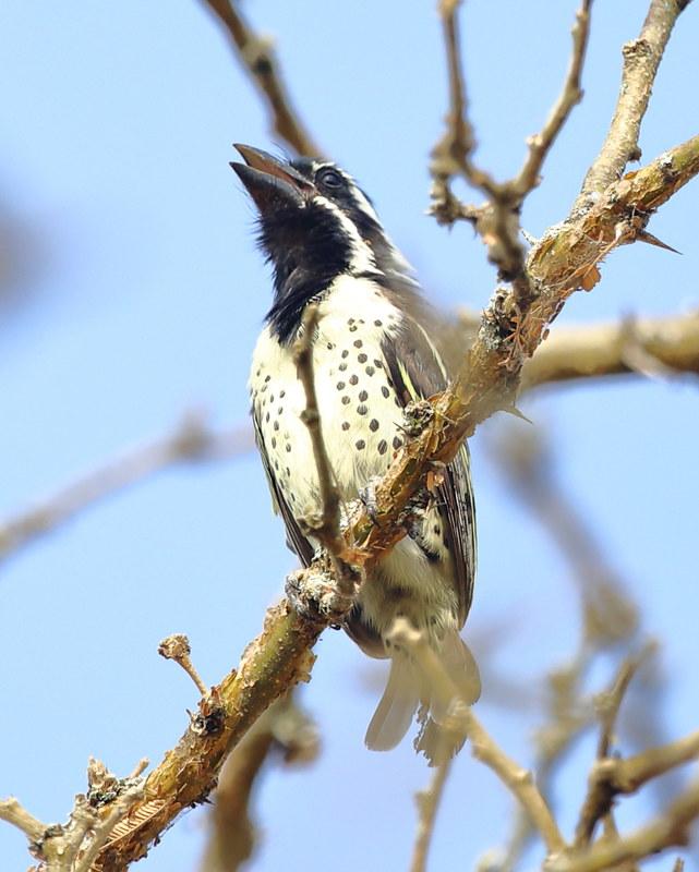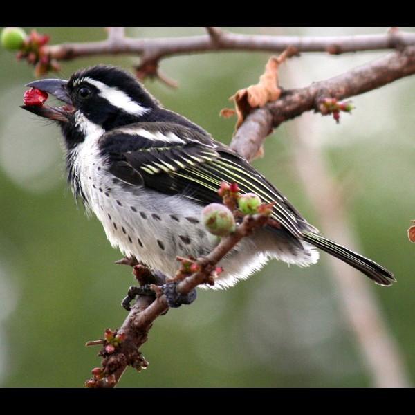 Тяжелый клюв окаймлен щетиной, как у всех бородаток. На горле - черный треугольник, а по бокам – черные пятна, отличающие ПЛ от других видов.