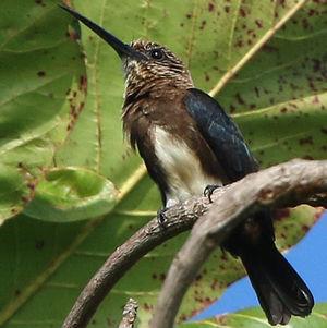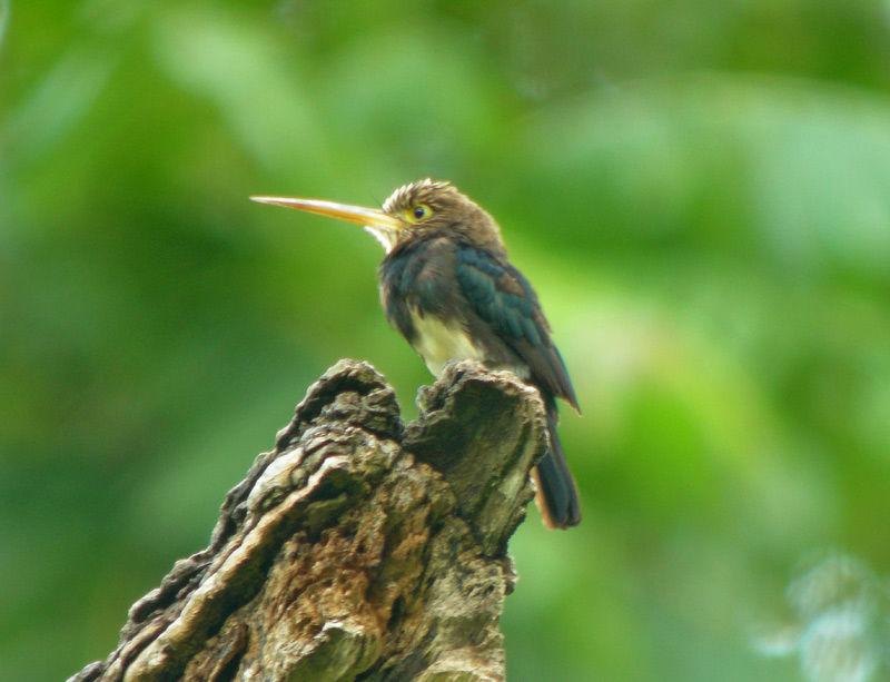 Небольшая (до 18 см) птичка из семейства якамар с длинным тонким клювом и маленькой головкой. Основной цвет – коричневый, с глянцево-голубовато-черными крыльями и хвостом, контрастирующими с белыми подбородком и животом.