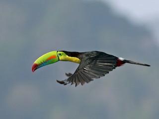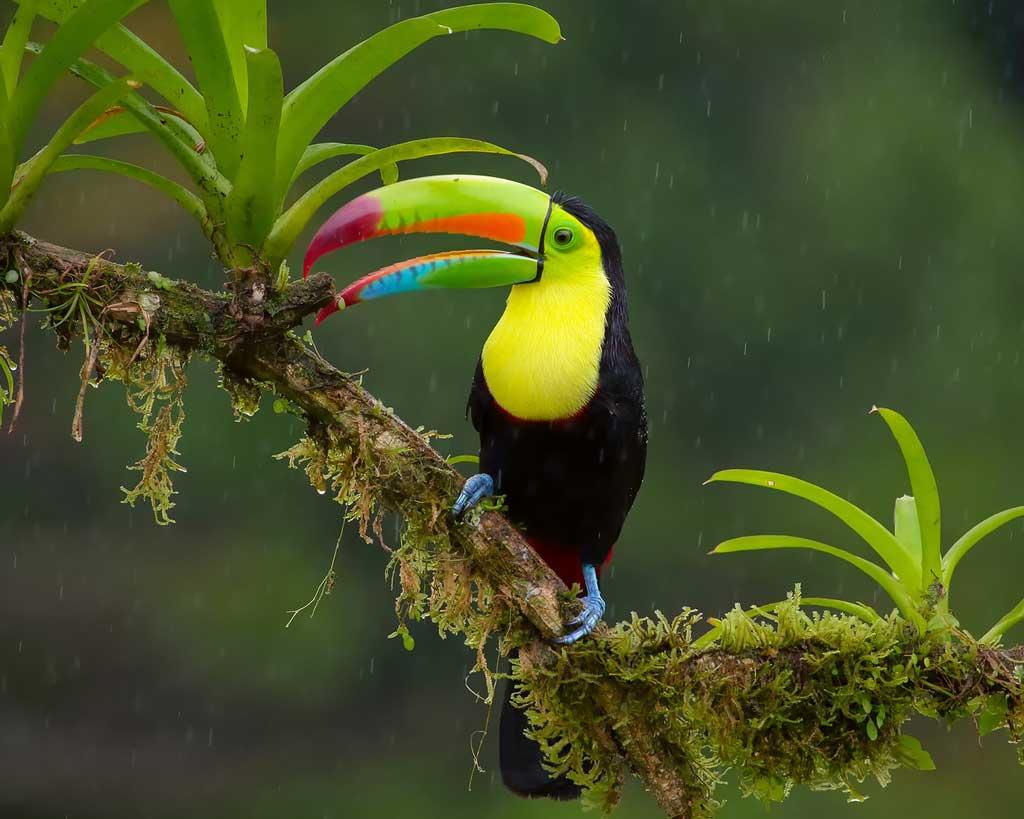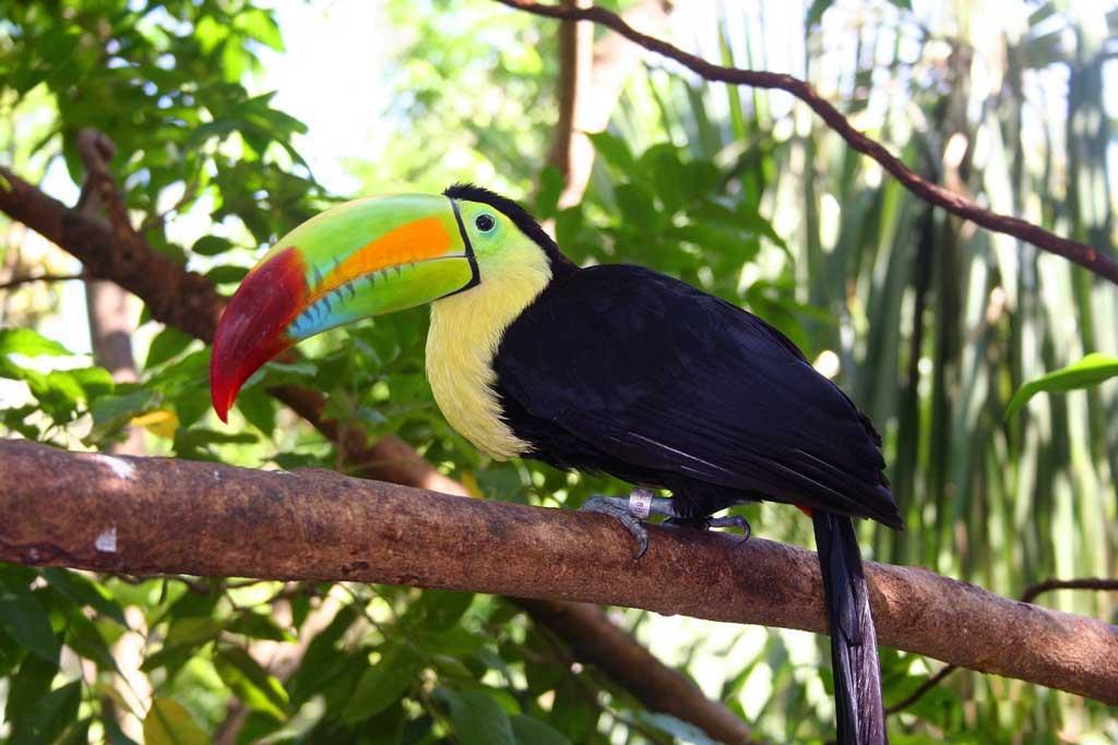 Яркая, радужная окраска зелено-голубо-черно-лимонно-красных тонов позволяет птицам хорошо маскироваться в джунглях Латинской Америки.
