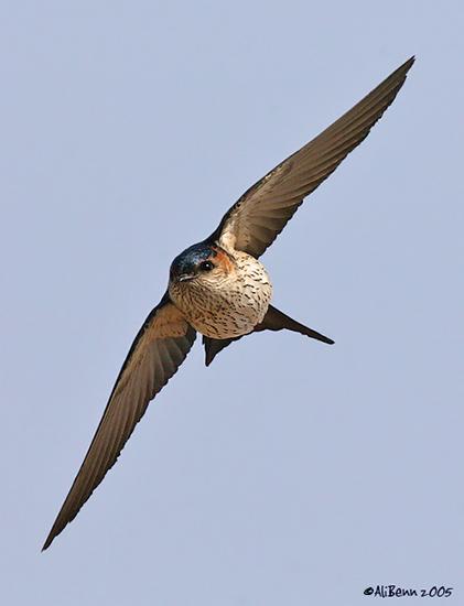 ответитьРЛ (каменная, горная, даурская) - небольшая (до 18 см, размах крыльев – ок. 34 см), изящная птичка. Основная окраска спины, крыльев, хвоста и темени — блестящая чёрно-синяя; низ тела, испод крыла и поясница бело-рыжие. С боков голова апельсинового цвета.Да, для ласточки – очень нарядная.
