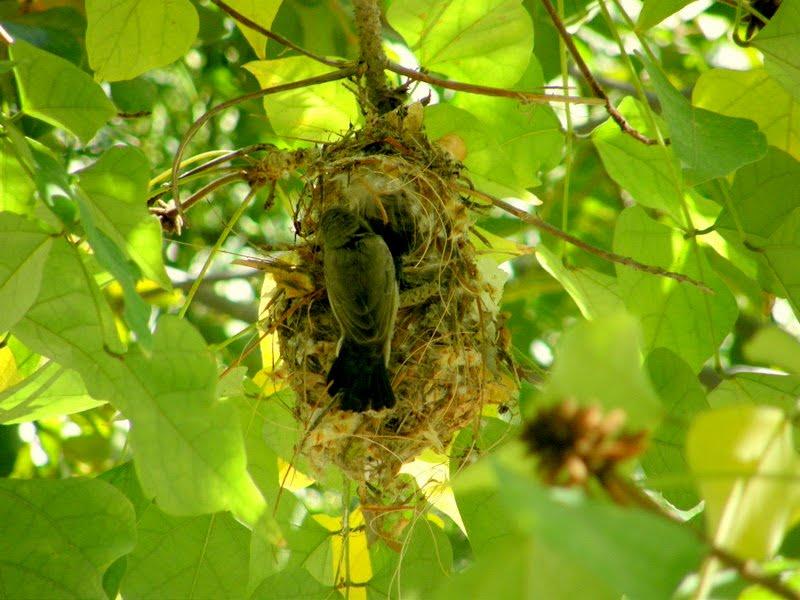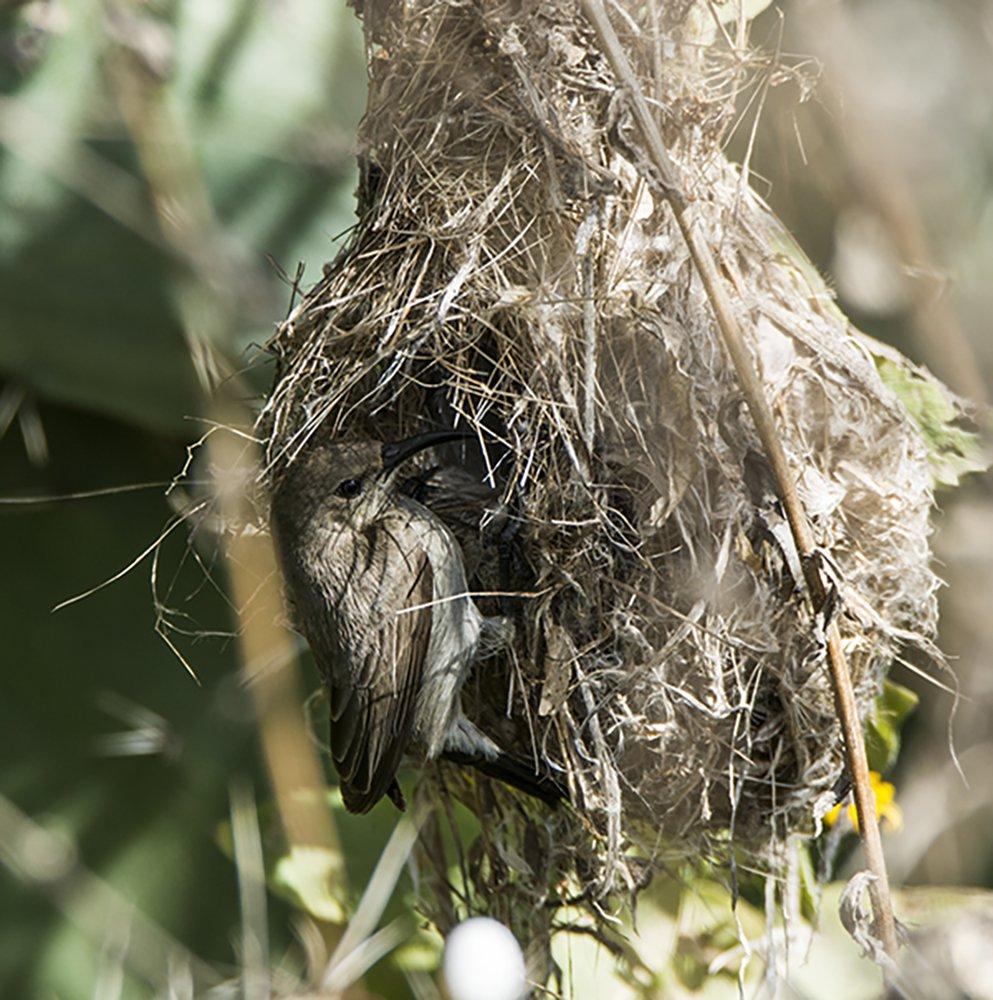 9. Гнездо представляет собой довольно небрежно свитый из тонких стеблей, листьев и корешков полностью закрытый «кошелек». Внутри выстлан перьями, шерстью, листьями и, как дань цивилизации - клочками бумаги.