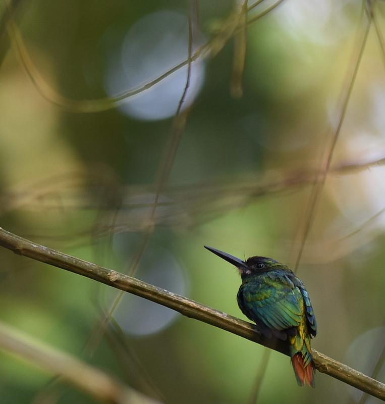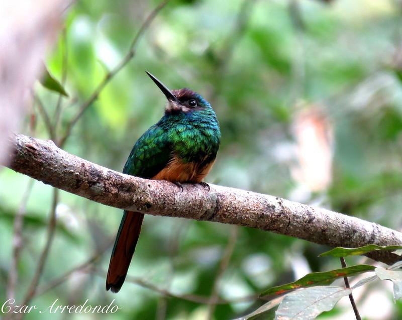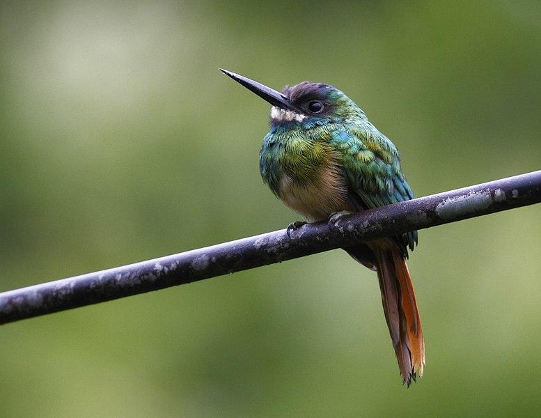 Спинка у БЯ зеленая с металлическим отливом. (Недаром якамар также называют блестянками) Нижняя часть – ржаво-красная, под клювом белое пятно. Голова серо-коричневая. Черный клюв - длинный, прямой и острый, как у всех якамар. Ноги короткие, хорошо приспособленные к лазанию по деревьям.