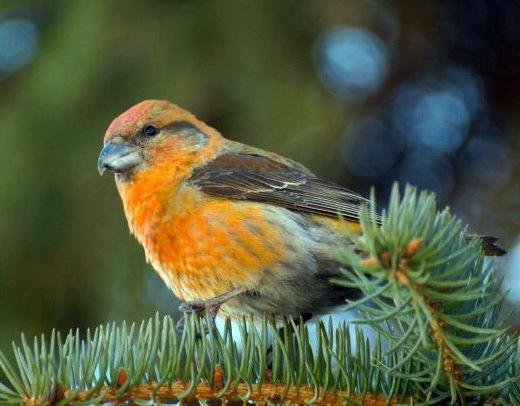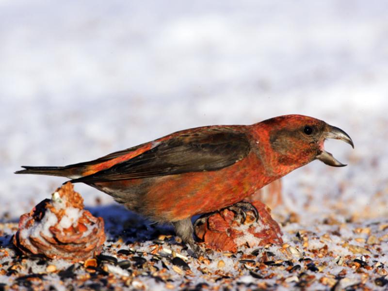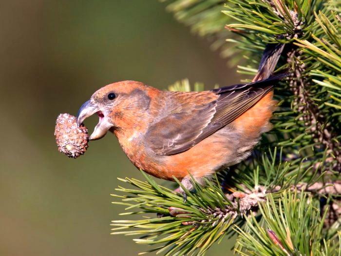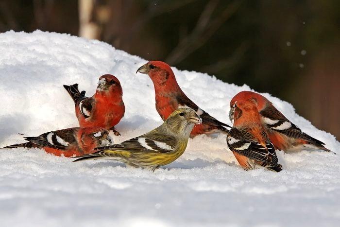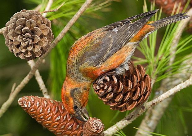 ...Лесную тишину нарушат вдруг веселые негромкие птичьи голоса. Стайка клестов пронеслась над головою, красными яркими бусами обсыпала вершину украшенной лиловыми шишками ели. Удивительно красивы эти красногрудые птички, оживляющие тишину зимнего леса! Стоишь и любуешься, как быстро и ловко теребят они тяжелые шишки, добывая из них семена. Одна за другой падают в снег растрепанные клестами шишки.Какой красивый и точный портрет получился!