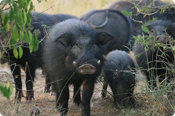 6-8. В семейных стадах царит строгая иерархия. Каждое животное знает своё место в очереди на пути к водопою или к месту отдыха. Стадом руководит старейший и сильнейший кабан, а замыкает шествие молодая самка.