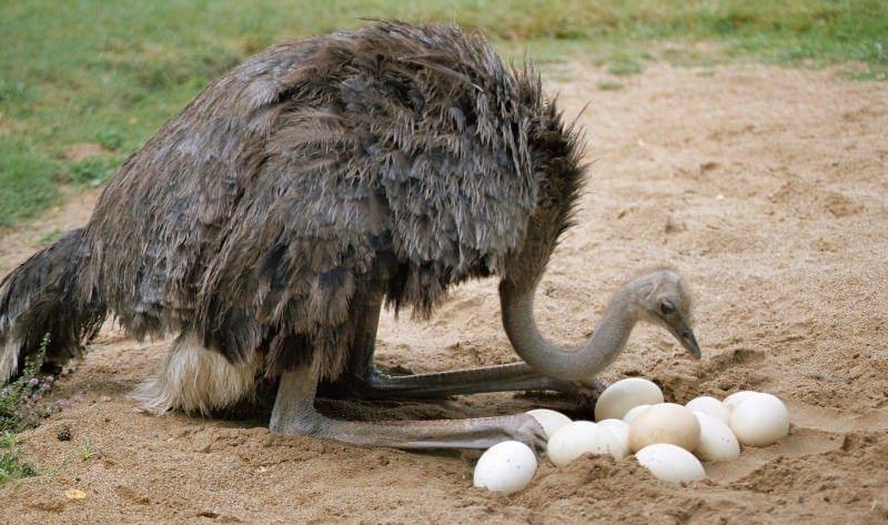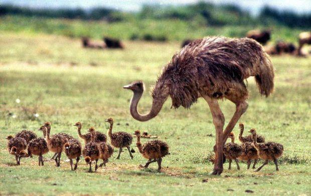 37 дней он бессменно сидит на гнезде, ненадолго отлучаясь от него лишь для кормежки - не более двух раз в сутки. Когда страусята вылупятся, он заботливо обогревает их, кормит, водит на прогулку. Самки же не принимают никакого участия ни в насиживании яиц, ни в воспитании потомства. Более того, как только их «властелин» садится на яйца, они всем гаремом уходят к другому.