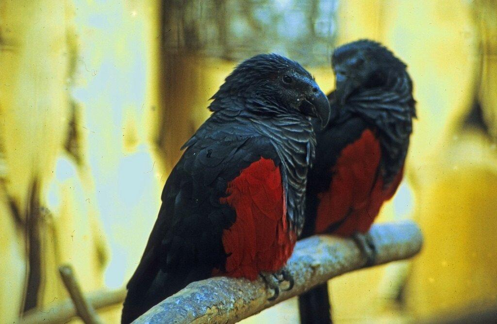 ОП (щетиноголовый или грифовый попугай, он же Дракула)— очень яркая птица размером до 0,5 м с необычайной окраской, которая превращает ее в настоящего гота птичьего мира. Черные как смоль клюв, голова и хвост, серо-черная грудь и алые перья, похожие на подкладку плаща, делают имя Дракула невероятно подходящим для этого попугая. Наполовину лысые головы делают их еще более устрашающими и привлекательными одновременно.Дракула, как есть Дракула!