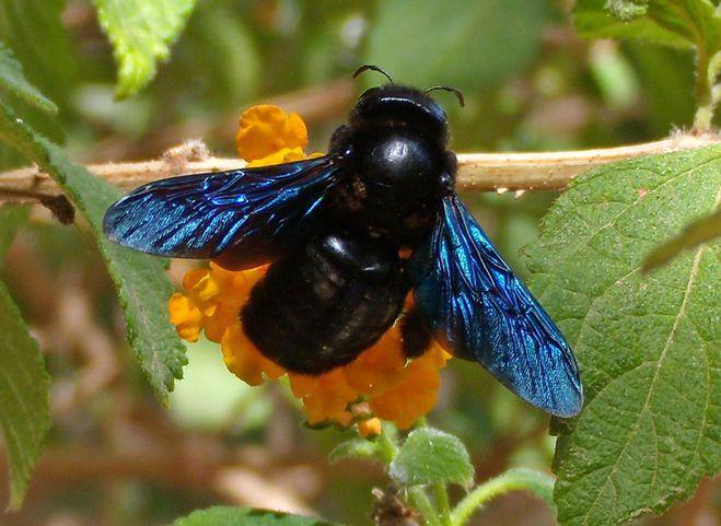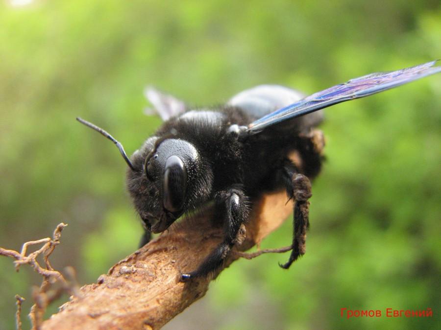 Тело плотное, черное, 2-3 см., в районе головы фиолетовый оттенок с металлическим блеском. Крылья с синеватым отливом, прозрачные, с фиолетовыми прожилками.