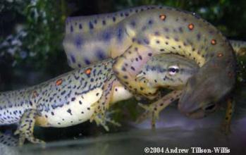 2. Во время брачных игр самец привлекает внимание самки движениями хвоста, обхватывает ее лапами и выпускает в воду сперматофоры, которые самка подбирает клоакой. Вылупившаяся на 20-й день личинка тут же присасывается ртом к ближайшему растению и приобретает защитную окраску в темную и светлую продольную полоску.