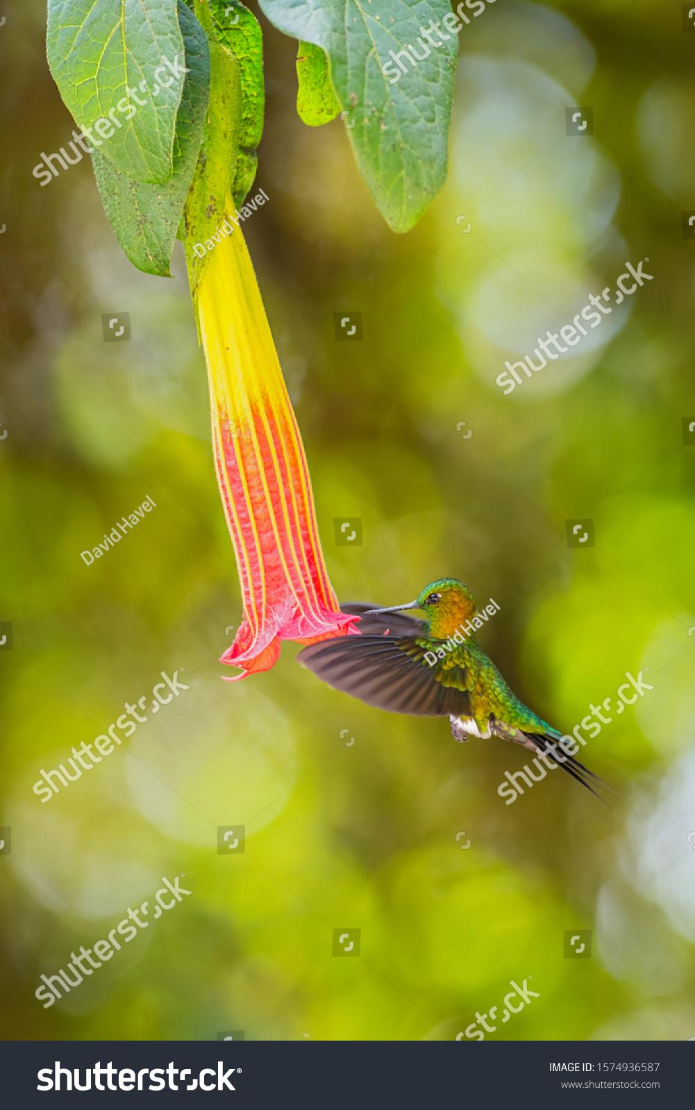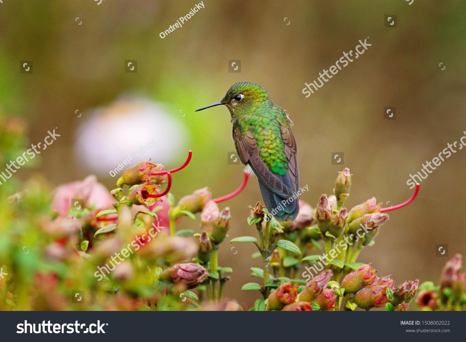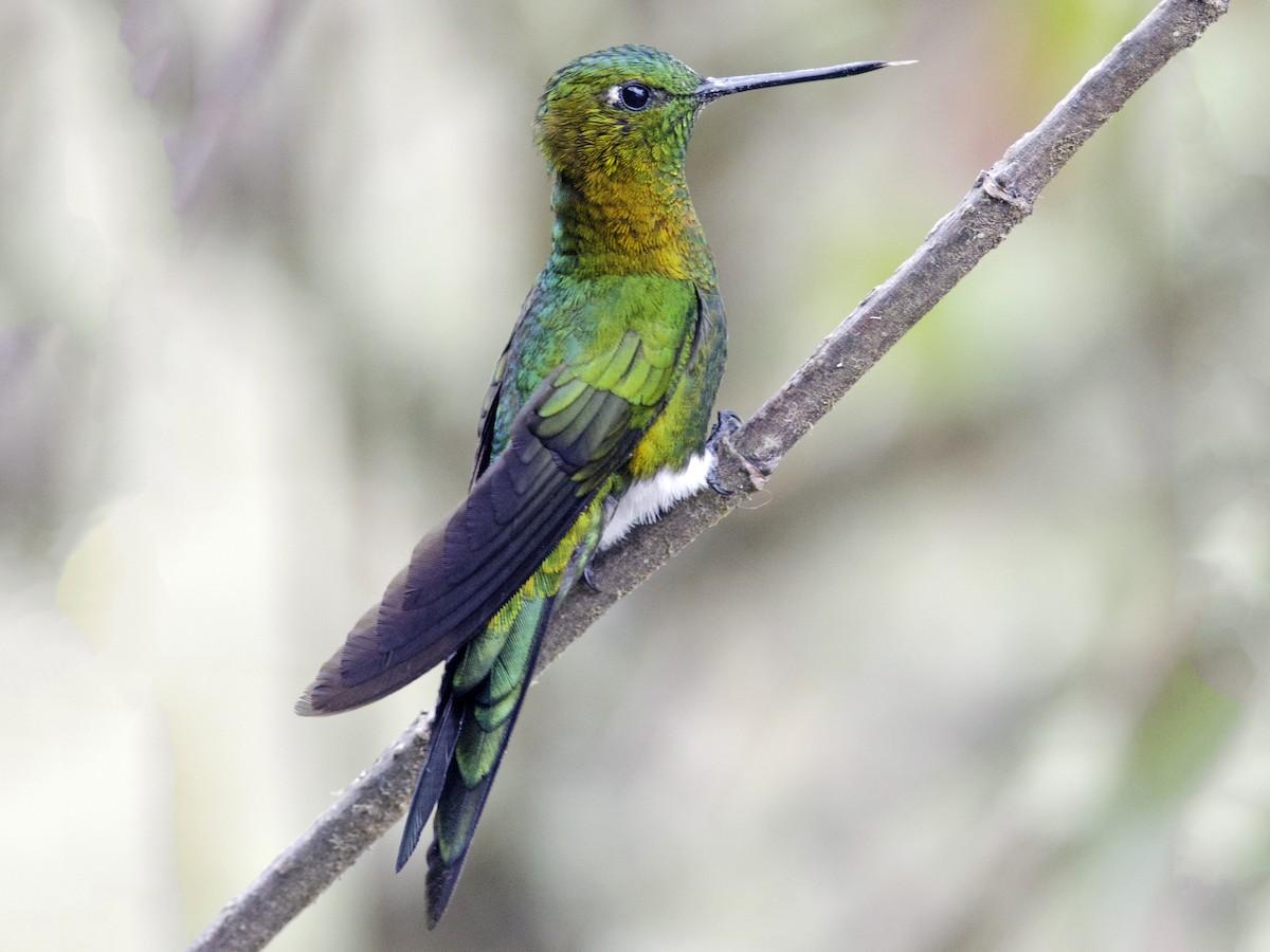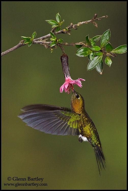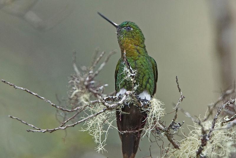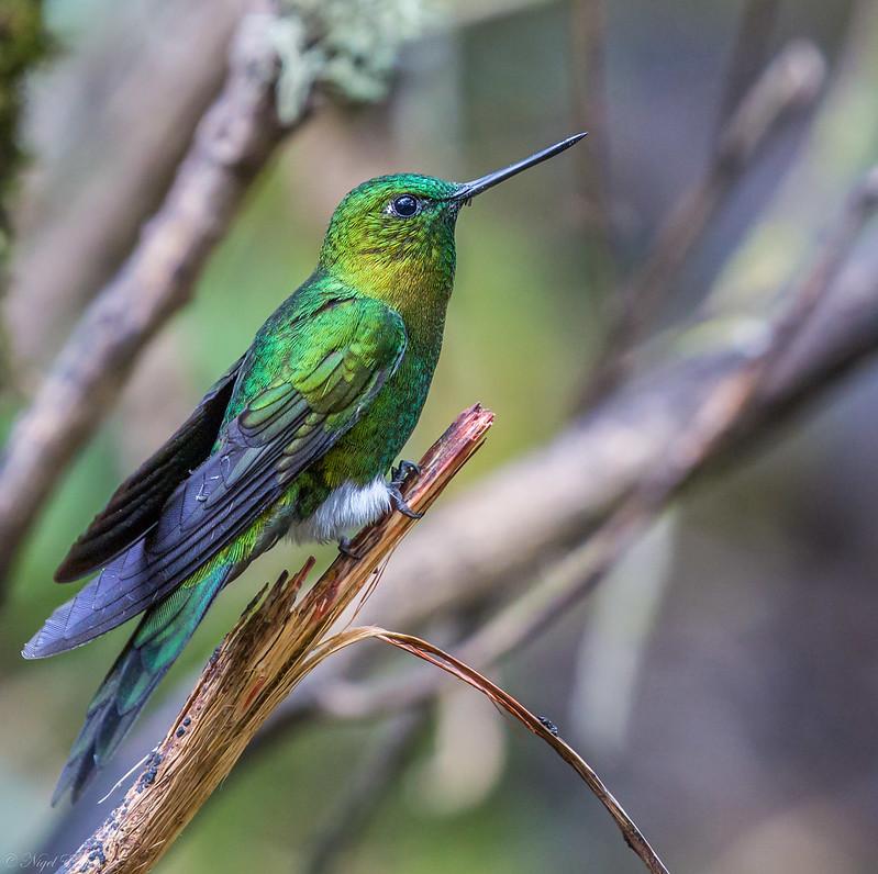 ЗЭ встречаются во влажных лесах, лесах и кустарниках на высотах от 1000 до 4800 м. над уровнем моря, в Эквадоре и Колумбии Самцы имеют красочное зеленое с отливом оперение, крылья с темно-синим отблеском а грудка отсвечивает золотом и медью. (самки несколько тусклее) Характерный длинный тонкий клюв, белые пятнышки за глазами. И, как у всех представителей рода экарионов, - белые пуховые «штанишки». Первый исследователь этих птичек, давший им родовое имя, немецкий натуралист Л. Райхенбах, называл их «белые трусики»А мне нравится название – как в древнегреческих мифах))