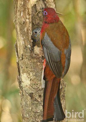 КАТ - яркая птица размером до 35 см из густых вечнозеленых лесов от центрального Непала, Юго-Восточной Азии, южного Китая до Суматры. Различается по окраске по всему ареалу, но всегда следует одной и той же общей цветовой схеме: у самца темно-красные голова и живот (уникальная особенность группы трогонов), коричневая спина и черно-белые крылья с перемычкой. У самки блекло-красный живот и коричневая голова. У обоих полов, если смотреть снизу, резко контрастирующий и градуированный черно-белый рисунок хвоста.Красавчик! Птица-фонарик))