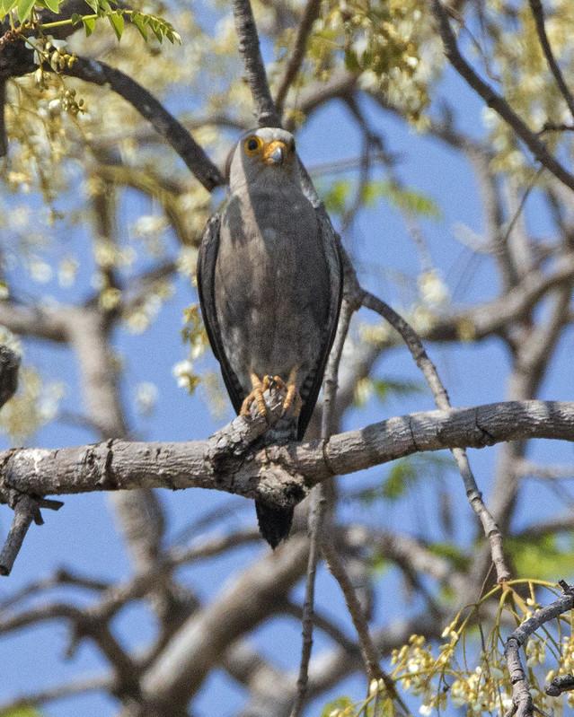 Оперение серое, с очень темным верхом и полосатым хвостом. Ноги желтые и такая же желтая «маска»