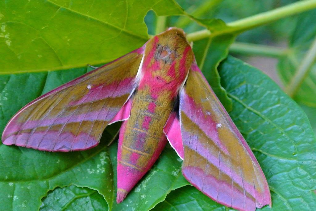 8. Гусеницы БВ питаются листьями кипрея. Они большие и толстые, как сосиски. На заднем конце тела - роговидный "шип" На боках грудных сегментов - тёмные "глазки" в белом ободке. Потревоженная гусеница втягивает голову, при этом её грудные сегменты раздуваются и глазчатые пятна становятся хорошо заметны. Получается такой "головастый" и "глазастый" червяк, который отчаянно мотает "головой" по сторонам. (см. фото 9) Если «превращение в змею» не срабатывает, то гусеница моментально прикидывается дохлой.