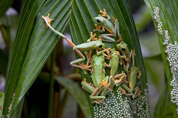 "Взрывное" размножение происходит в сезон дождей. Яйца откладываются небольшими скоплениями на верхней стороне листьев, нависающих над водой. Головастики вылупляются примерно через шесть дней и падают в воду