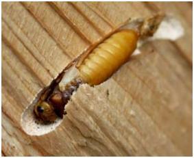 Личинки РБ проедают ходы в древесине.На самом деле они питаются не деревом, а грибами, которые расщепляют клетчатку.
