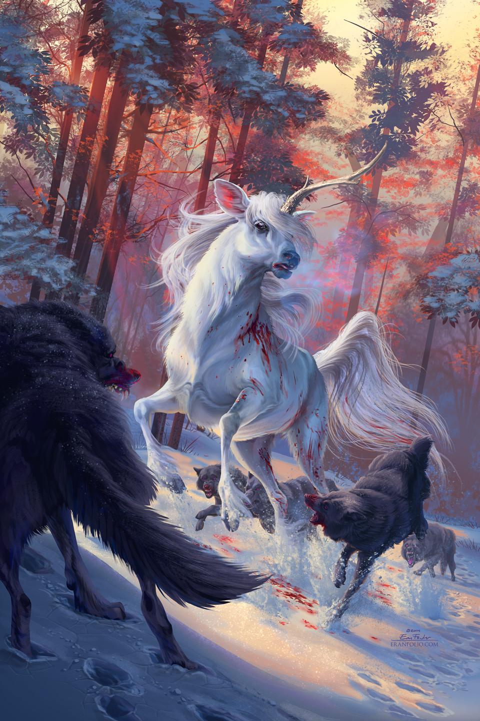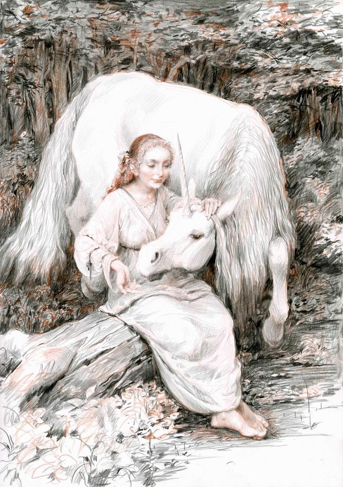 Единороги — мифологические и фэнтезийные создания, напоминающие изящную помесь лошади и оленя с одним вперёдсмотрящим рогом в центре лба. Образ единорога менялся на протяжении истории, сейчас в основном связывается с феями, лесам, эльфами и природойДаже не помню у автора такого нежного, чистого и светлого изображения. Воистину сказочный персонаж!