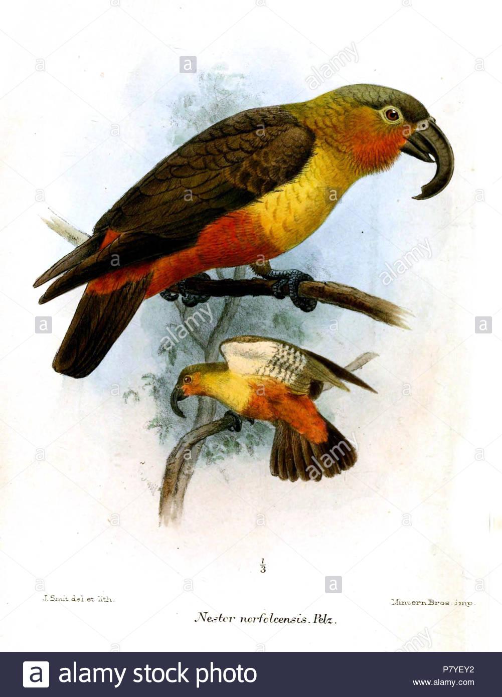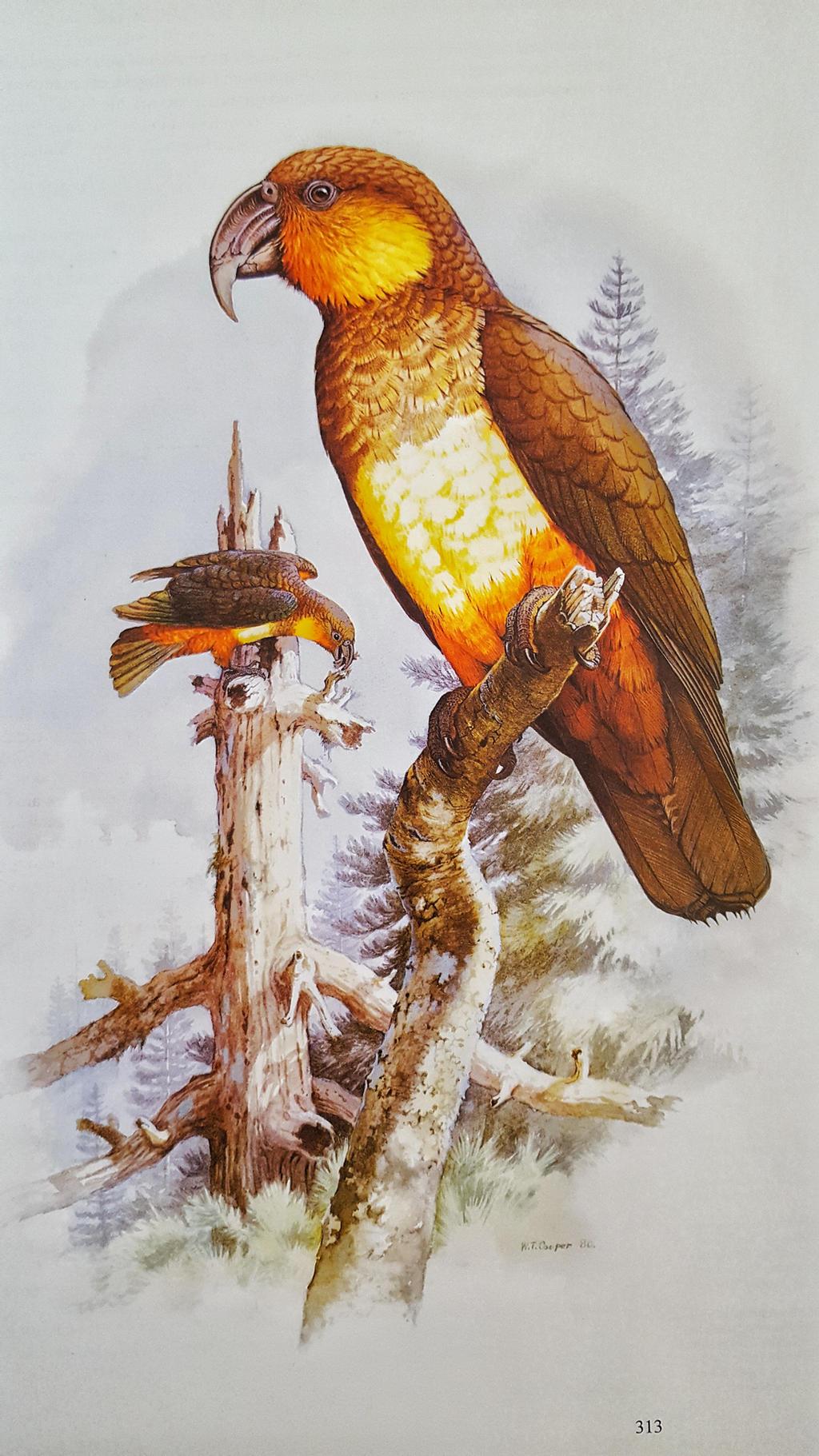 ответитьТН - попугай, истреблённый человеком к середине XIX в. Это был некрупный вид семейства несторов длиной ок. 40 см. Окраска сверху бурая, горло и щёки оранжевые, нижняя сторона тела и поясница - жёлтые и красные. От новозеландских кака и кеа он отличался формой клюва, что отражено в названии.Красивая птица... Как жаль...