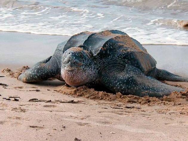 ...После кладки черепаха принялась засыпать гнездо песком, работая преимущественно задними ластами. Удостоверившись, что все следы уничтожены, она поволокла свое огромное трехметровое тело к воде.