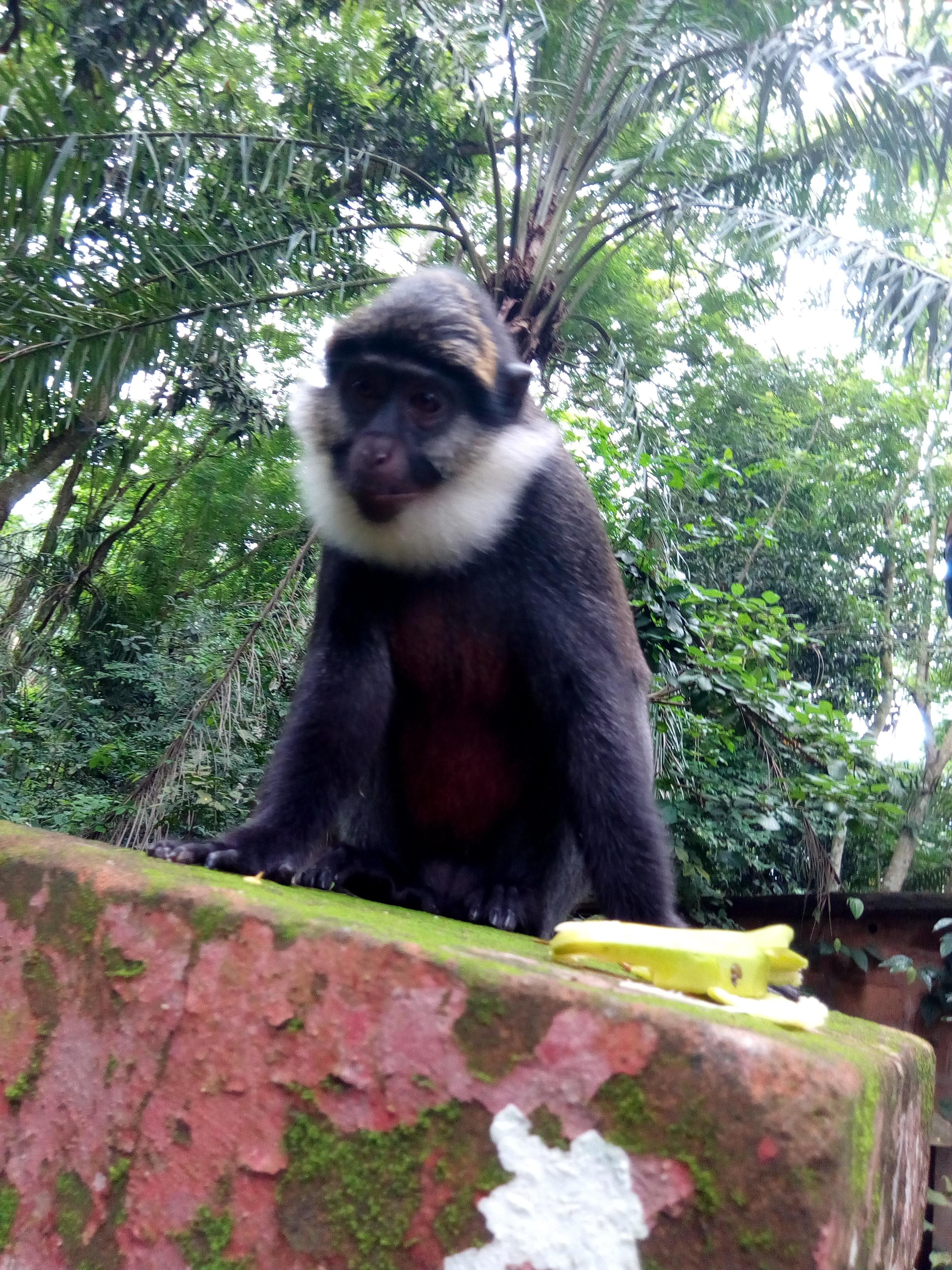 КМ считалась вымершей. Но небольшая группа была обнаружена у р. Нигер в 1988 г. Сейчас КМ живет в нигерийских лесных заповедниках и священных рощах в БенинеОчень своеобразная, чем-то сильно ошарашенная обезьяна))