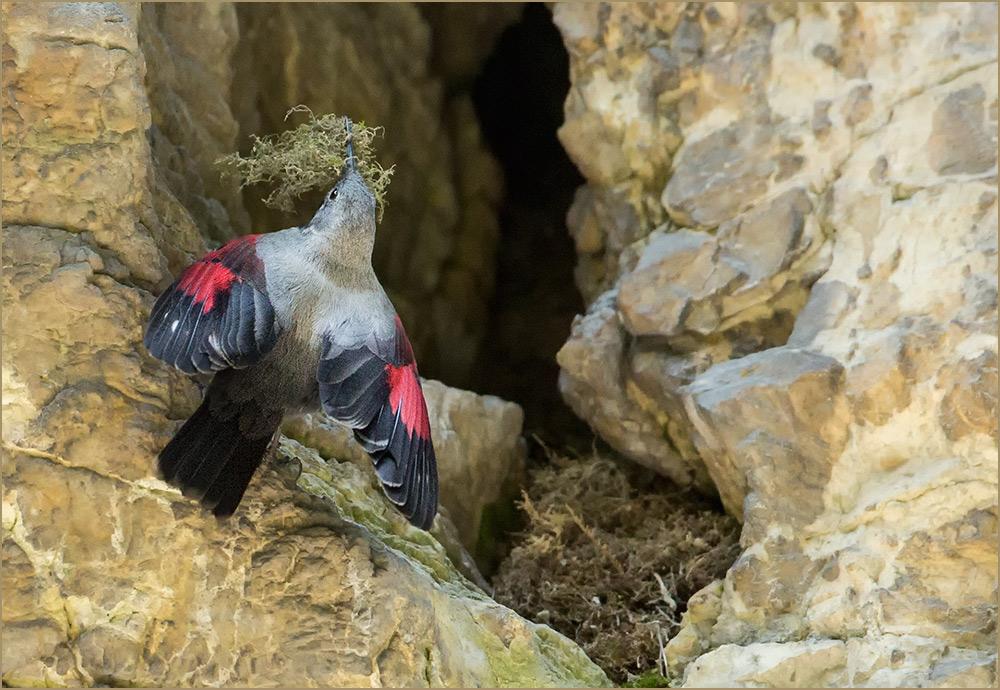 9-10. Гнездо устраивает глубоко в нишах и расщелинах скал. Самец "выступает" и поет самке специальную песню, похожую на флейтовые трели.