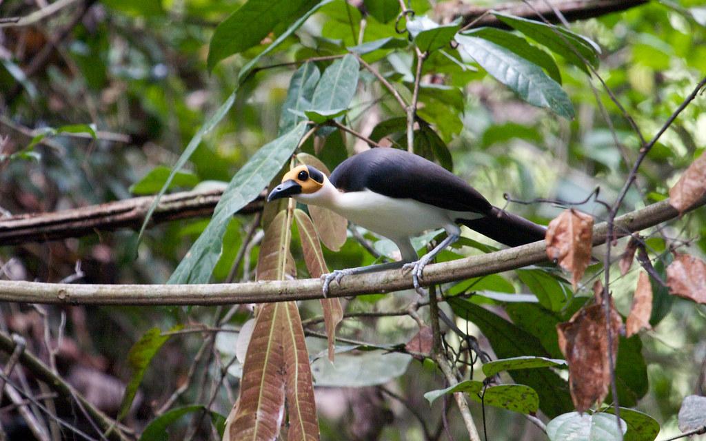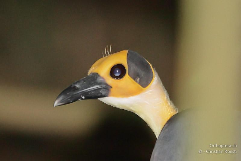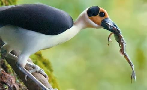 Эти необычного вида птицы с желто-черной лысой головой очень скрытны, редко подают голос и общаются друг с другом "шепотом", обмениваясь тихими, шипящими фразами.