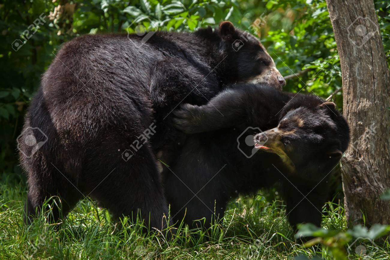 Вокруг глаз могут располагаться белые или желтоватые кольца в виде «очков»; морда, по ср. с другими медведями, укорочена. Достигает размеров до 1,8 м, в высоту – ок. 0,8 м.