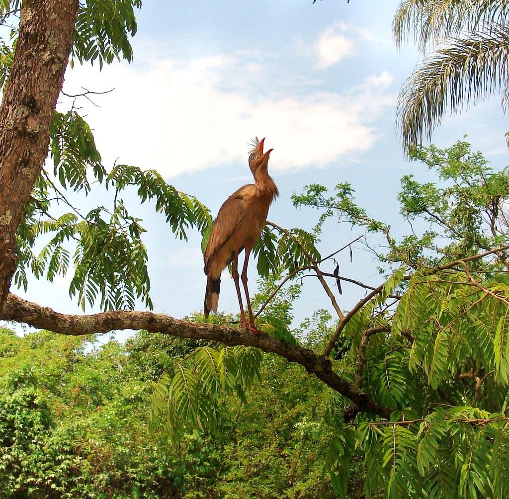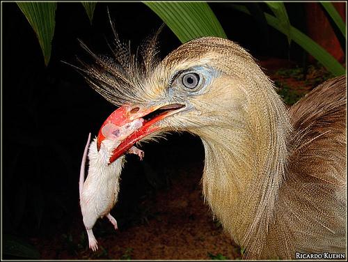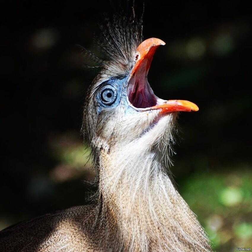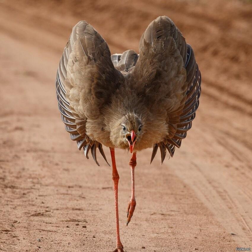 ответить...Самыми большими птицами в лагере были кариамы. Туловище их, величиной с курицу, было посажено на длинные крепкие ноги; на длинной шее сидела крупная голова, напоминавшая голову ястреба, со слегка загнутым на конце клювом и большими серебристыми глазами. Шея и спина нежного серовато-коричневого цвета, книзу переходящего в кремовый. Над самыми ноздрями, у кариамы торчат забавные пучки перьев. Когда эти птицы с обычным для них надменным видом бродили по лагерю, изогнув шею и откинув голову, они очень напоминали высокомерных верблюдов в перьях.Парадный портрет кариамы кисти Большого Сердитого Волка)