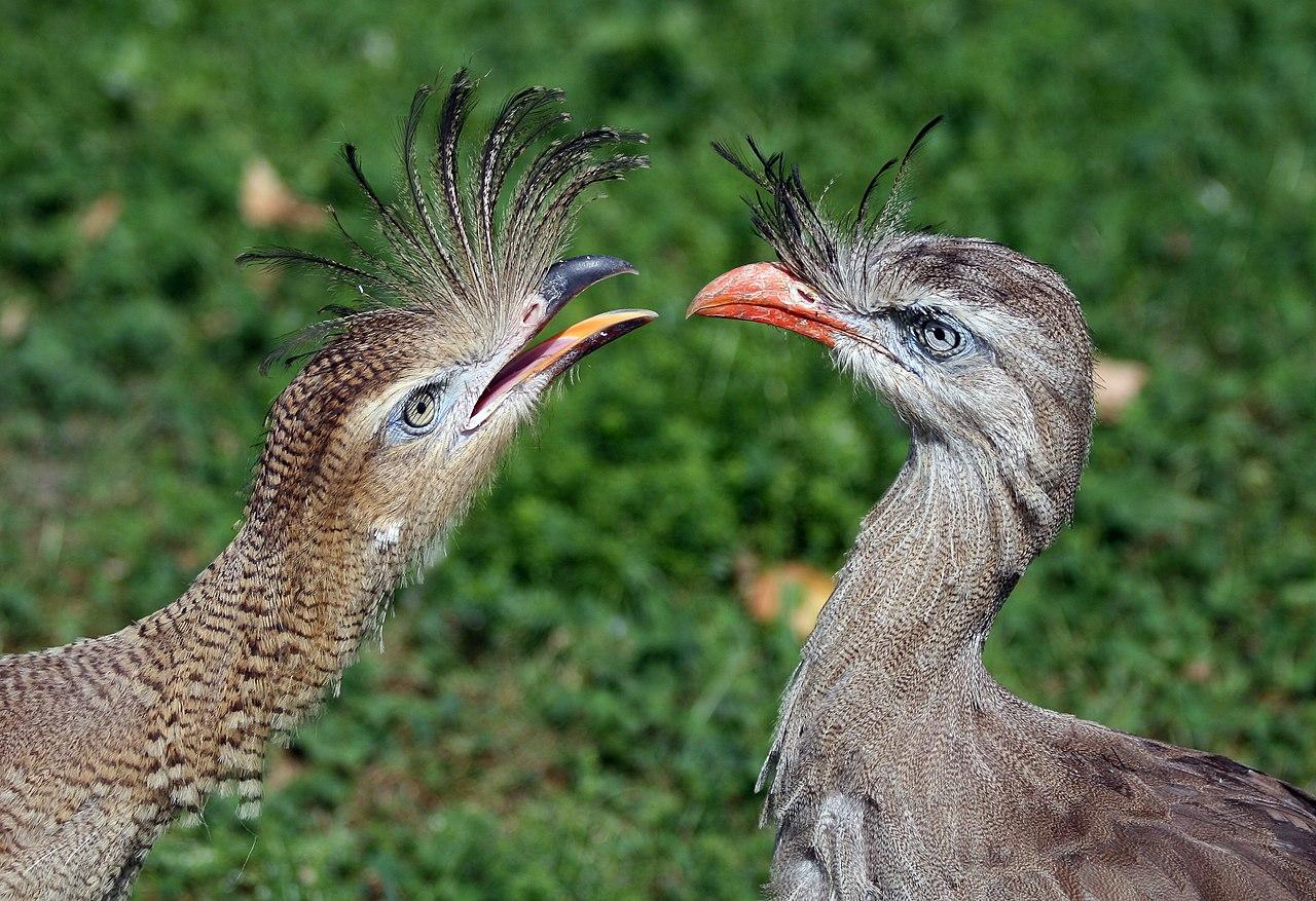 ...Одна из них находила ветку или пучок травы, поднимала его, приближалась к подруге большими, танцующими шагами... Обе птицы пристально разглядывали добычу, а затем начинали выделывать пируэты на своих длинных неуклюжих ногах, церемонно раскланиваясь друг с другом и распуская крылья; при этом они время от времени ... подбрасывали ветку или траву в воздух.