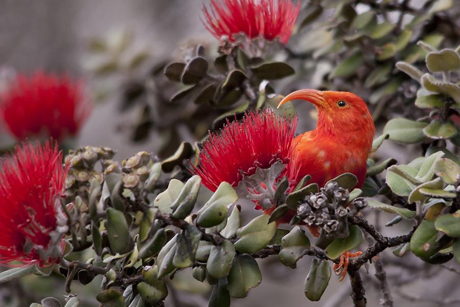 Эта маленькая (15см), подвижная птичка с алым оперением и черными крыльями – один из самых узнаваемых символов Гавайских о-вов (Кауаи, Оаху, Молокаи, Мауи и Гавайи).Пичужка-красотушка!