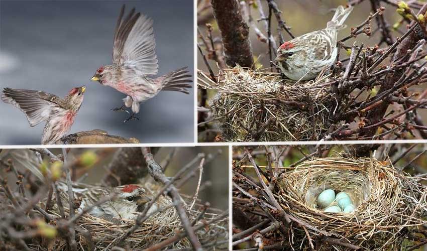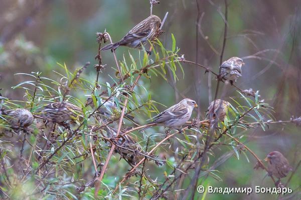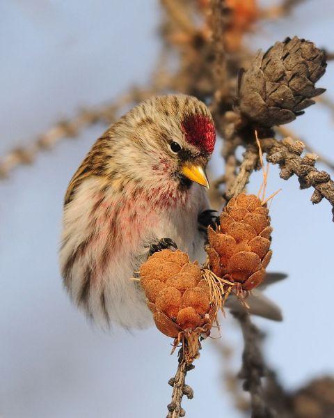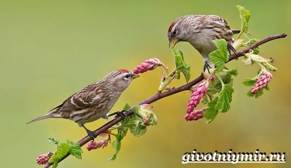 Главная примета, видимая издалека, — это красная шапочка на головках. У самцов красные перышки есть и на груди, как у снегирей.
